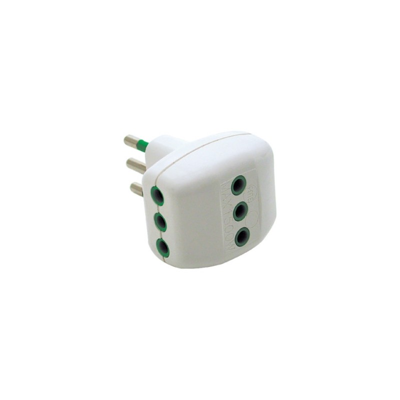 Adaptador Triple Fanton, que consta de enchufe, italiano enchufe 2P+T 10A y 3 italianos tomas 2P+T 10A color blanco