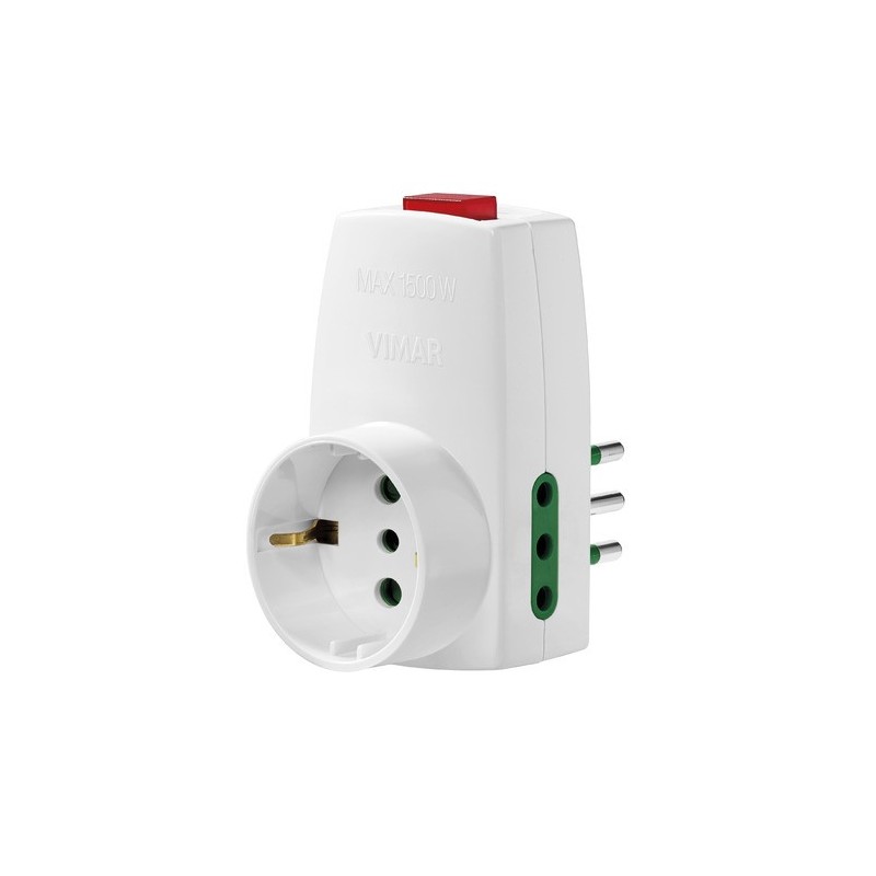 adaptador triple Vimar 1500W de color blanco, con enchufe 10A (pequeño) y 2 sockets 10A (pequeño) 1 schuko 16A socket (ronda) con el interruptor de color rojo brillante para encender y apagar 0P00330.B