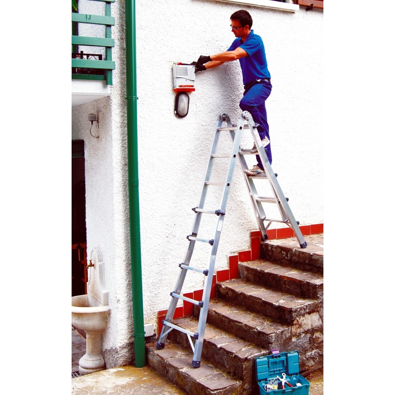 Escala Frigerio a la extensión telescópica hidráulica reforzada con la bisagra en el rapid traverse altura max 3,91 metros (totalmente extendido), máxima altura del trípode 1,78 - max de carga de 150Kg, Paso total de 8+8, peso 13 kg, altura máxima de la mesa de trabajo con la 3.78 mt. Cierre de cremallera con tapa de protección de mecanismo de resorte contra la infiltración de agua y la corrosión.