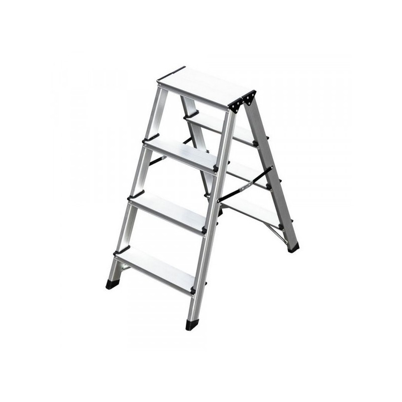 Taburete plegable Profesional Frigerio aluminio doble subida, la altura es de 1.06, los pasos, incluyendo la plataforma de 2x4 - anchura de la escalera 0,53 m - Peso: 6,5 Kg - Paso antideslizante mm de profundidad. 83 unido al mástil por medio de un resistente de la soldadura rincón escondido de la vista, Pilar caja de doble alma mm. 80 x 23, Barra espaciador, automático de seguridad anti-apertura y anti-cierre de aluminio anti-óxido, características técnicas, ver más abajo.