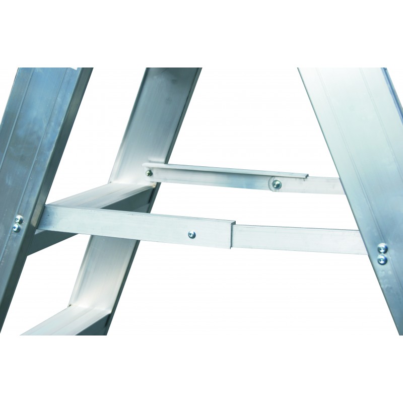 Paso antideslizante mm de profundidad. 83 se unió a los marcos con fuertes soldaduras oculto de la vista del Mástil cerrado bobina mm. 80 x 23 Estantería terminal de aluminio mm. 200 x 300 Barra espaciador automático de seguridad anti-apertura y anti-bloqueo de aluminio antioxidante de Refuerzo en el extremo inferior para el apoyo a la base con anti-shock Pies aumentó con la superficie anti-deslizante, Embalaje de la película de encogimiento del fuerte de 80 micras Año de producción y la marca del fabricante del Folleto y las reglas de uso Apto para trabajar en ambientes industriales que requieren de apoyo, muy estable y seguro en todas las condiciones de uso y que permite viajar práctico y rápido.