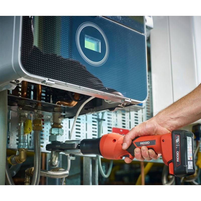 - La RP 219 viene con la nueva generación de batería avanzada de iones de litio de 18 V y cargador rápido para la mayor cantidad de prensados por carga y sin tiempo de inactividad en el sitio. El nuevo cargador rápido de RIDGID también incorpora la exclusiva función de carga en el coche de RIDGID, que permite cargar las baterías en el coche o furgoneta mientras se conduce al lugar de trabajo