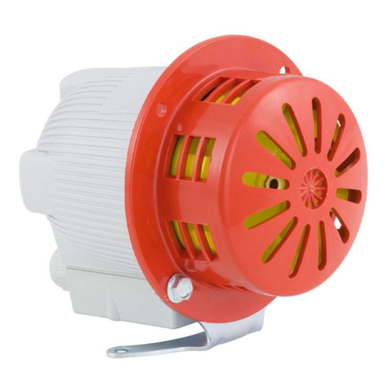 Sirena electromecánica diseñada para aplicaciones industriales. El dispositivo, consistente en un motor eléctrico conectado a un ventilador interno, genera un sonido largo y agudo.
