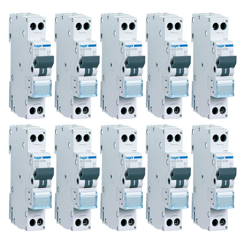 Kit de disyuntores termomagnéticos Hager 1P+N 10A 4,5KA C 1 módulo MJN510A