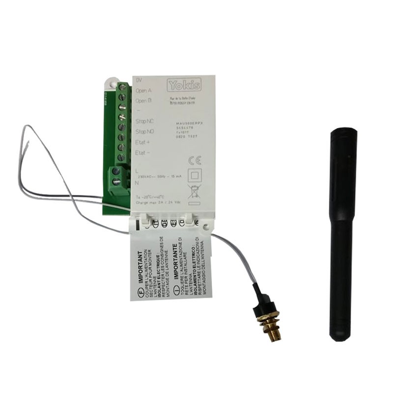 Actuador de Urmet MAU500ERPX para puertas automáticas y persianas con antena externa, permite el control automático de puertas, correderas, de entrada, y motores para persianas. Se puede ordenar por cualquiera de los transmisores de radio Yokis (controles remotos y de los transmisores, montado al ras) que tiene un botón para girar.