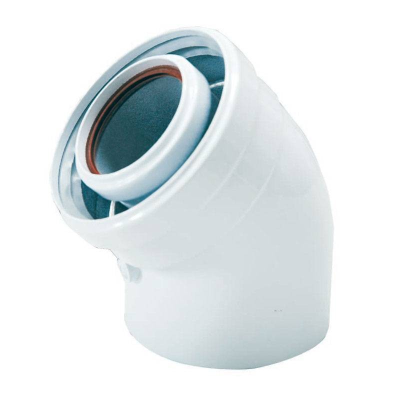 Codo coaxial 45 grados Ferrari para calderas y calentadores de agua con las siguientes características: