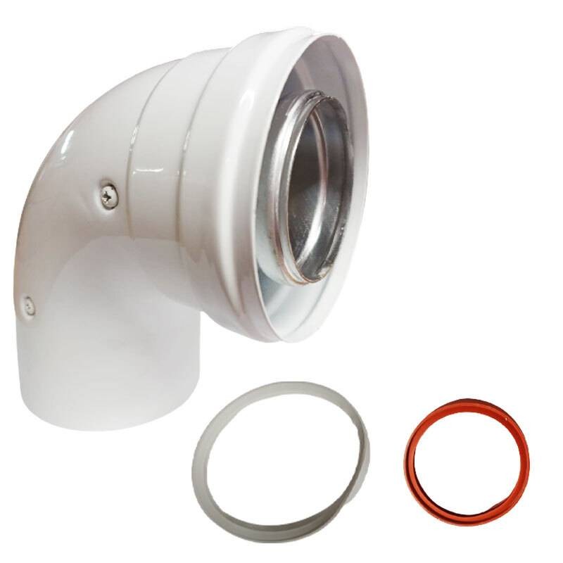 Codo coaxial 90 grados Ferrari para calderas y calentadores de agua con las siguientes características: