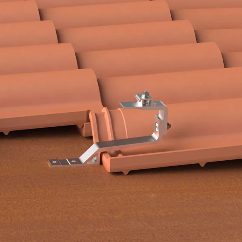 Gancho de aluminio para la instalación de paneles fotovoltaicos en cubiertas de teja plana sin banda de ventilación.