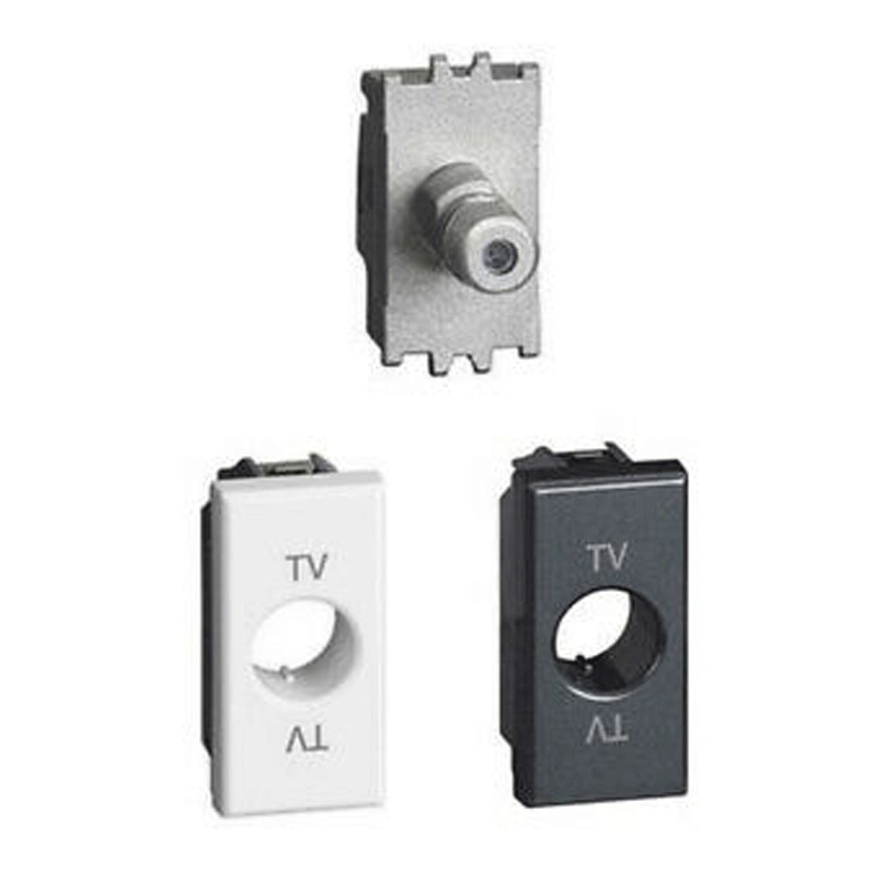 Toma coaxial directa de TV Legrand Vela, para sistemas de antena de usuario único, también con control remoto y centralizado, y sistemas de satélite de usuario único y centralizado con paso de corriente y señal para la selección de canales. Terminales de conexión apantallados con tornillos cautivos de 9,5 mm de diámetro, conector macho. Se suministra en un paquete con motor neutro y paneles de acabado en los mismos colores de los mecanismos. 1 módulo. Se suministra la cubierta en blanco y negro.