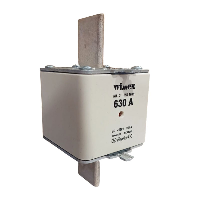 Fusible de baja disipación Wimex NH gG, 630 amperios, 500 V. Los fusibles industriales de tipo NH gG se utilizan normalmente para la protección de cables, líneas eléctricas y equipos contra sobrecargas y cortocircuitos.