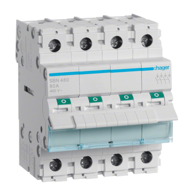 Interruptor de desconexión Hager 80A 4 polos 400VAc 4 módulos SBN480