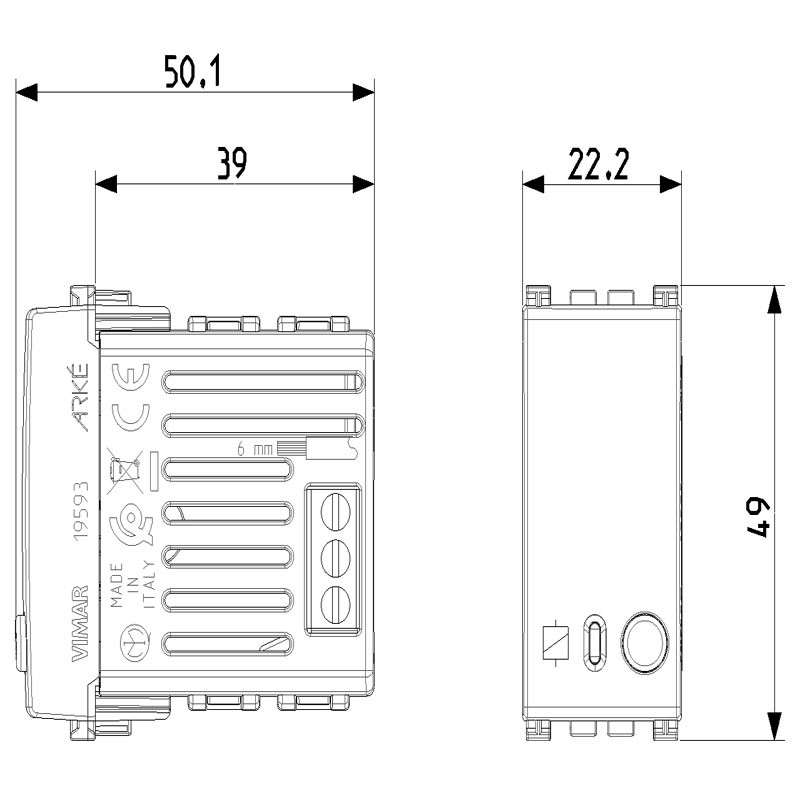 - Terminales: - 2 terminales (L y N) para línea y neutro - 1 terminal (1) para salida de relé de tensión
