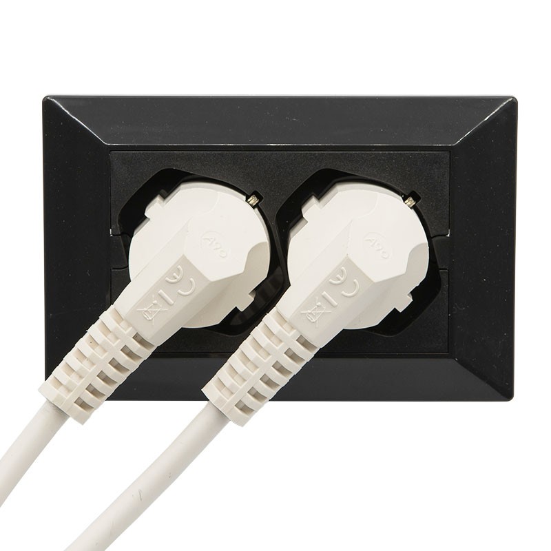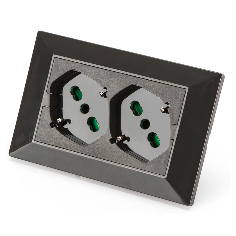 Toma de corriente empotrada Fanton Opera con 2 tomas dobles italianas/alemanas 2P+E 16A, 3 Módulos, montaje directo en la caja (ejemplo 503E) sin utilizar los soportes, la placa se fija a la caja empotrada sin añadir más accesorios. Color gris antracita.