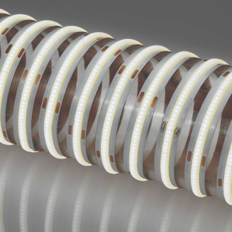 Tira LED flexible IP20. LEDs COB montados en circuito flexible blanco regulable de 24Vdc con cinta de doble cara 3M en la parte posterior. Longitud 5000mm, se puede cortar cada 45,4mm. Alto confort visual CRI90, 528 LEDs/m, haz de luz de 120° para un resultado uniforme e ininterrumpido. Curvatura vertical, radio mínimo de 60 mm. Se sugiere su instalación en perfiles de aluminio, que deben pedirse por separado. La fuente de alimentación y la unidad de control no están incluidas.