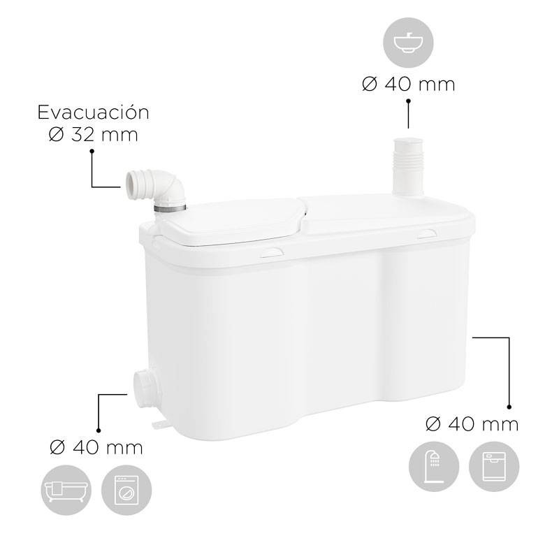 Bomba de aguas residuales SFA modelo Watersan 20, conecta la cocina, el baño completo (excepto el inodoro) y el lavadero. Conecta el desagüe de agua limpia: lavabo, bañera, ducha, bidé, lavadora/lavavajillas: