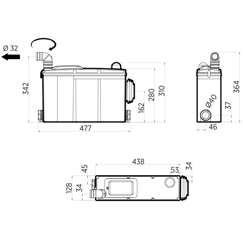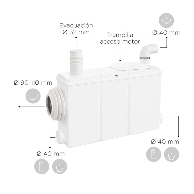 - Entradas laterales: 2 x Ø 40 mm + 1 x Ø 110