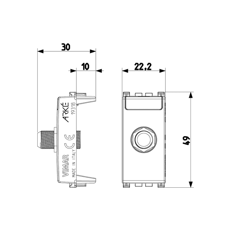 Toma coaxial Tv Sat Vimar Arke con conector hembra tipo F (IEC 60169-24), 1 módulo color gris. Para frecuencias de hasta 2400 MHz. Conexión de entrada y salida a través de conector macho tipo F 01654.