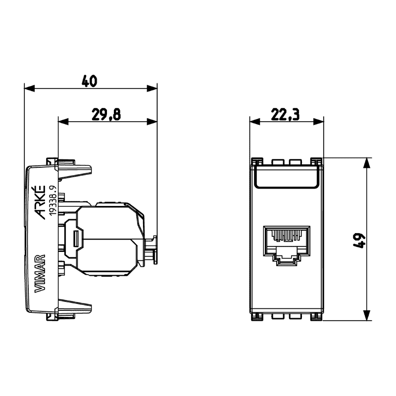 Toma de datos Vimar Arke RJ45 con conector Netsafe Cat. 5e, sin apantallar, cableado universal T568A/B, 8 contactos, terminales aislados sin necesidad de herramientas, 1 módulo, gris.