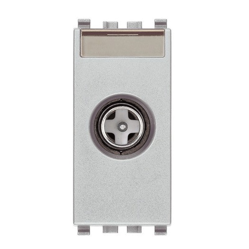 Toma coaxial TV-RD-SAT Vimar Eikon, frecuencia 5-2400 MHz, directa (derivada), con conector macho, atenuación de derivación 1 dB. Permite el paso de corriente continua y de señales de control (24 V 500 mA máx.), 1 módulo, color gris próximo.