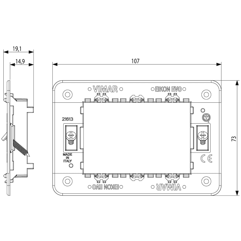 Soporte para cualquier módulo box 3 (frutas) aunque no sea de la marca Vimar. Este soporte permite enganchar sólo las placas Vimar Eikon.
