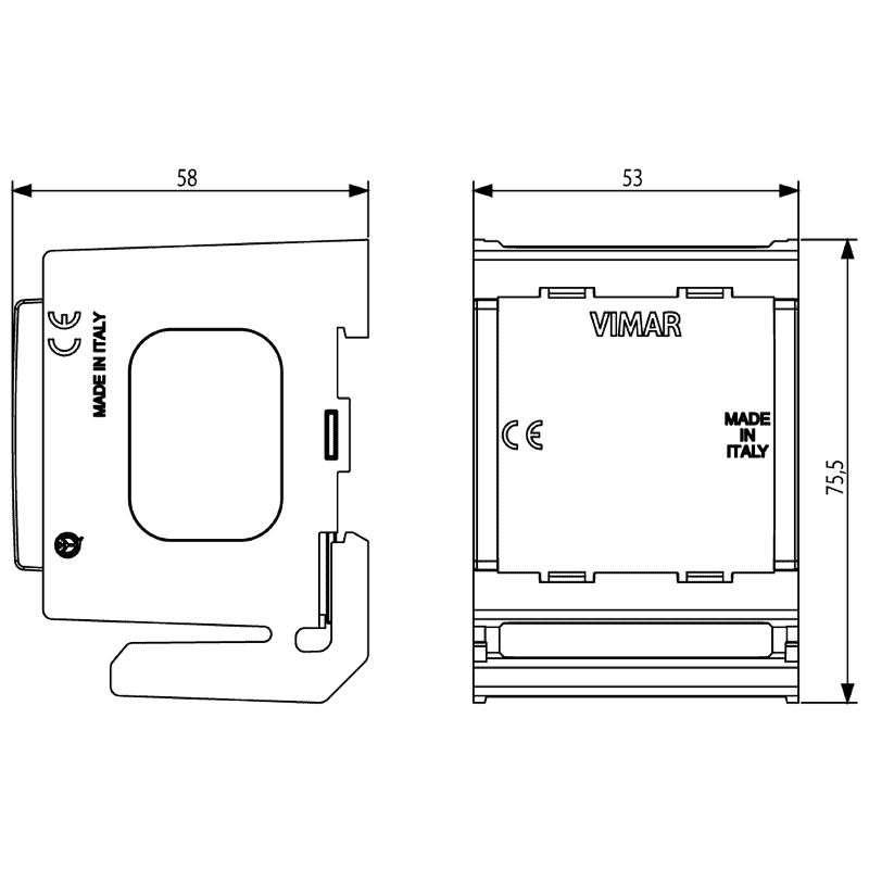 - Soporte de 2 módulos para la instalación en carril DIN (60715 TH35) de aparatos compatibles con la serie Vimar (Eikon, Arké y Plana)