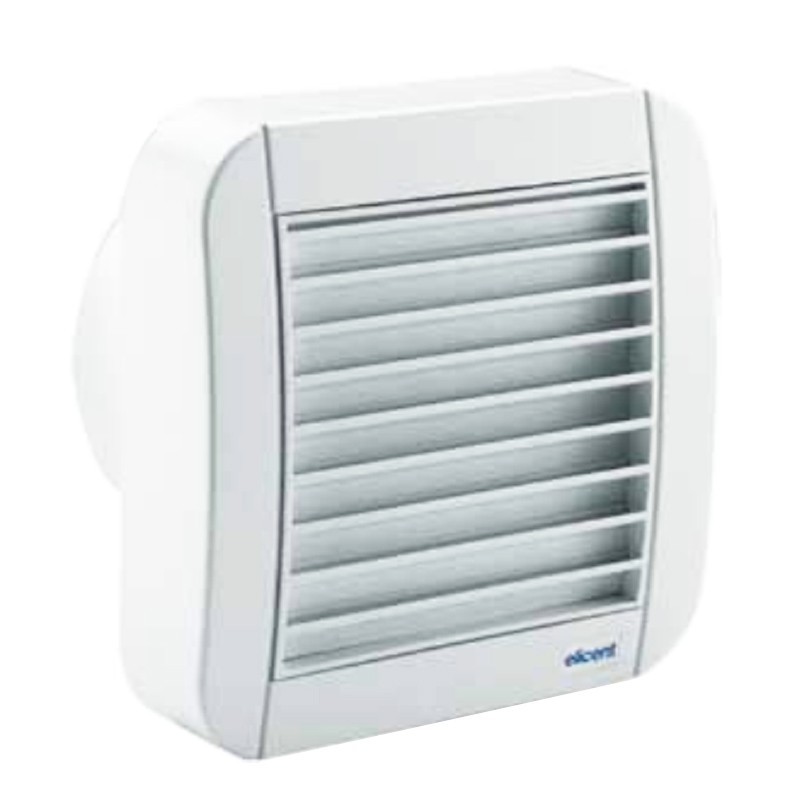 Ventilateur extracteur d'air et d'odeurs Elicent modèle ECO LINE 100 GG à expulsion directe hélicoïdale à ailettes pouvant s'ouvrir et se fermer par gravité, pour l'extraction d'air dans des environnements de petite et moyenne taille tels que : salles de bains, toilettes, placards, cuisines, caves, buanderies, etc.