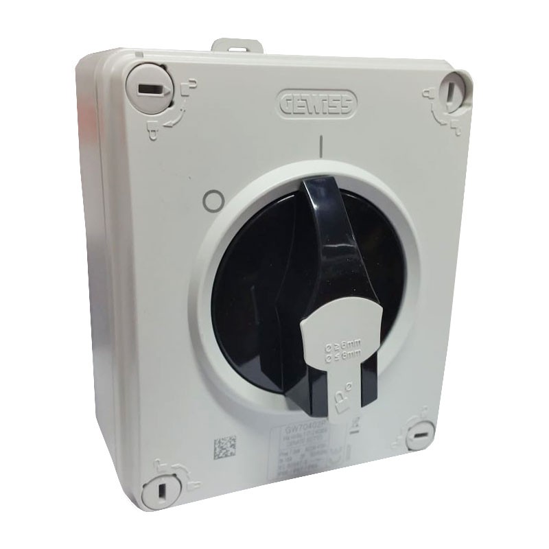 Déconnecteur à interrupteur rotatif Gewiss HP, avec les caractéristiques suivantes :