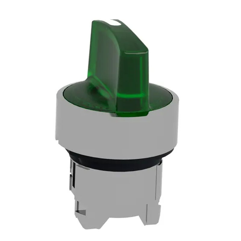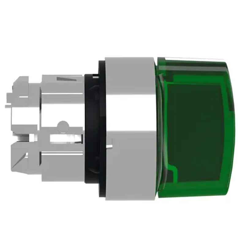 La tête de sélecteur de lumière verte Harmony XB4 de Schneider Electric pour LED universelles avec levier standard a 3 positions et fonctionne avec un ressort de rappel au centre. Il a une forme ronde et une bague en métal chromé.