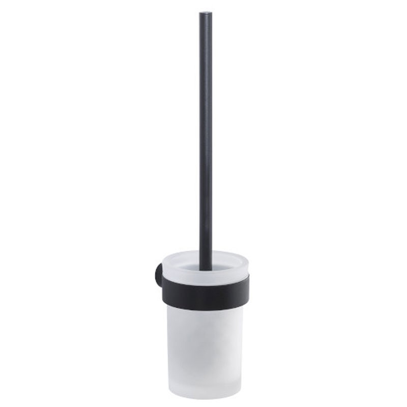 Pot à balai mural Gedy Pirenei en acier inoxydable et cromall, avec récipient en verre dépoli, couleur noir mat, touffe de poils, dimensions 8,4x10,4x37cm.