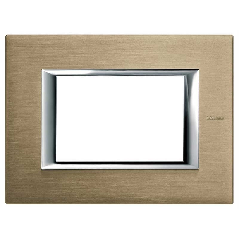 Plaque carrée 3 places Bticino Axolute pour support H4703. Couleur Titane brossé. Il n'est pas possible d'installer la plaque sur les autres séries Bticino mais uniquement sur la série Axolute.