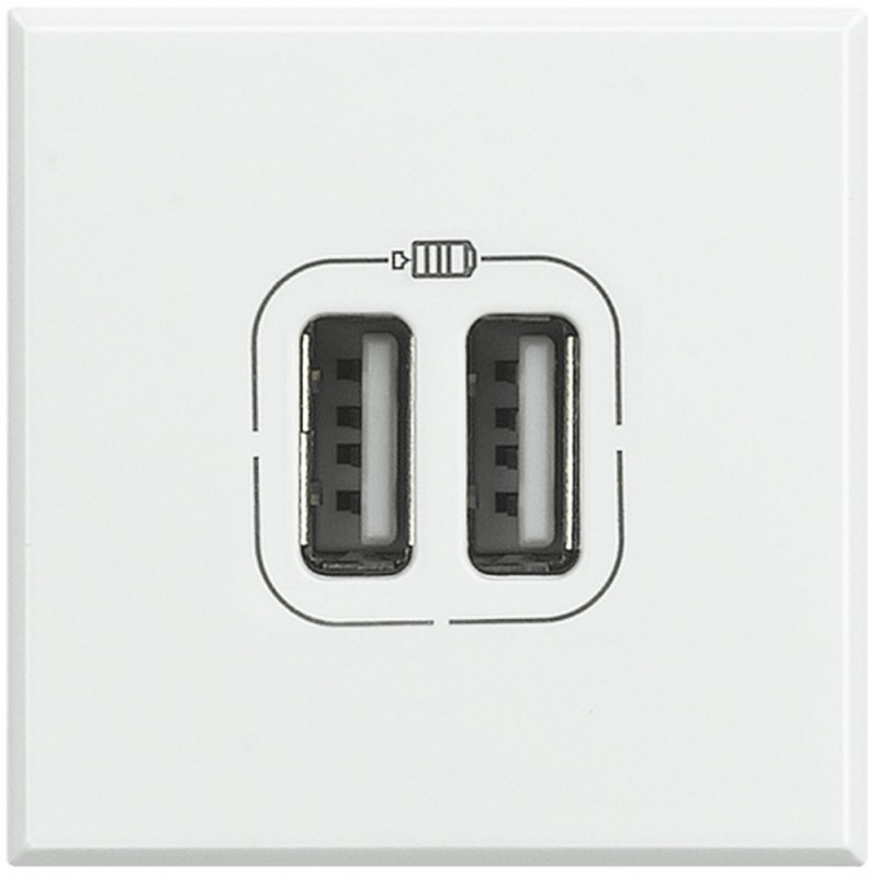 Chargeur USB double prise Bticino Axolute blanc. Le chargeur est alimenté et sert à charger des téphones, des smartphones, des tablettes et tous les appareils qui peuvent être rechargés via USB.