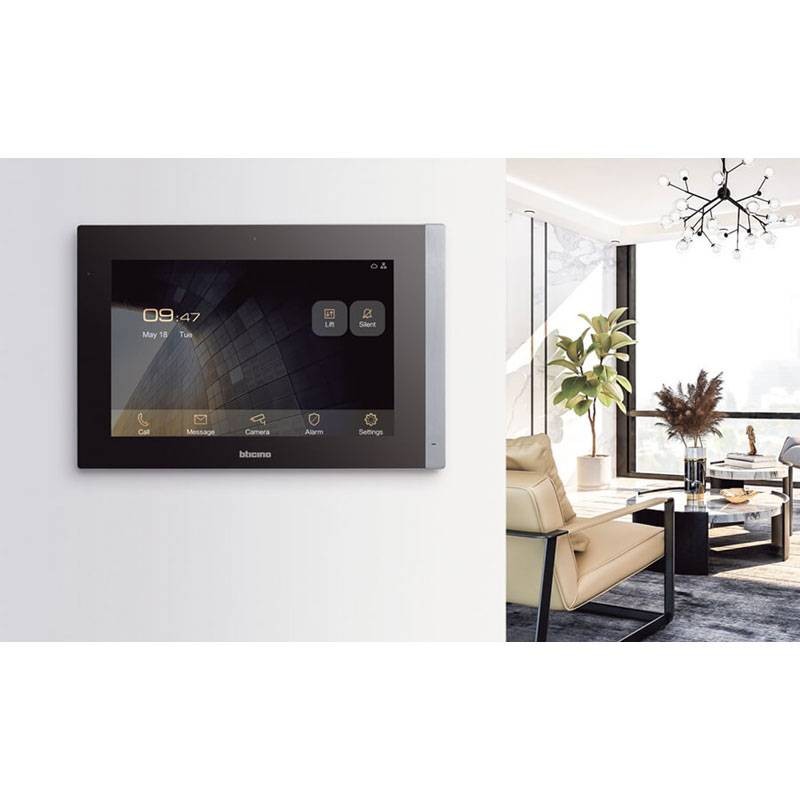 Vidéophone avec système IP Bticino, écran tactile de 7 pouces et bouton SOS. Il est possible d'associer le vidéophone à l'application Home + Security (disponible pour Android et iOS). Installation murale avec support fourni.