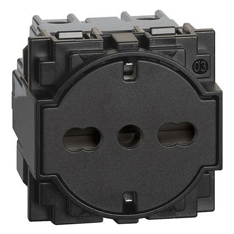 Prise Schuko Bticino Vivant Maintenant à PLAT 10/16A, 250 Va.c. de couleur noire, 2 modules. entraxe 19 mm et 26 mm en configuration de dérivation. Les Alvéoles sont protégés. Côté contacts pour la broche de terre l'allemand standard. Prise à PLAT standard allemand et italien. La surface du support, lorsque la fiche est insérée, elle glisse à l'intérieur de l'habitacle; retourné à la position initiale lorsque la fiche est tirée.