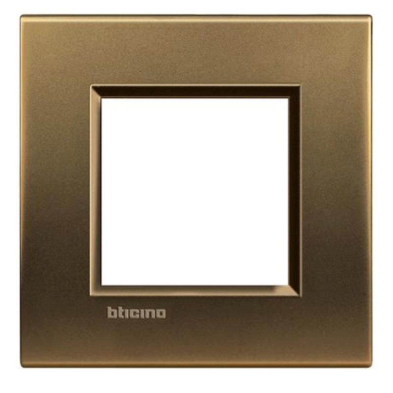 Plaque Carrée 2 modules (inserts, places) Bticino LivingLight couleur bronze poli. Elle ne peut être installée que le support LN4702, LN4702G. La plaque n'est pas installée sur les autres séries Bticino mais uniquement sur LivingLight.