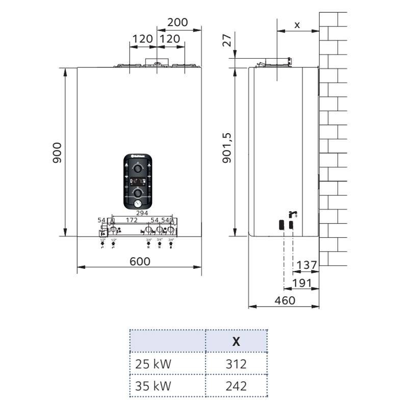 Fonctionnement au gaz naturel, au GPL et au propane sans kit. La conversion s'effectue par le contrôle de la combustion en sélectionnant le type de gaz dans le menu technique.