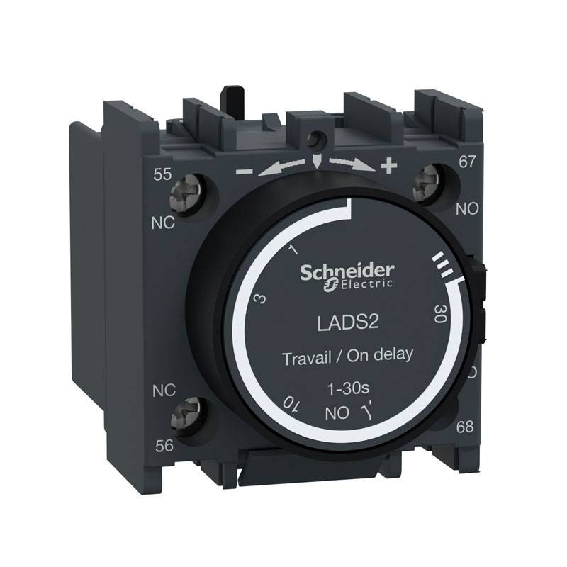 LeLADS2 est un bloc de contacts auxiliaires temporisés Schneider Electric pour les contacteurs TeSys D et TeSys F. Bloc monté en façade, il est équipé de contacts 1NO+1NC jusqu'à 10 A 690 V AC, avec une plage de réglage de la temporisation à l'excitation de 1 à 30s. Facile à monter en façade grâce à un clip, il garantit une fiabilité et une durabilité élevées. Disponible dans le monde entier, il est certifié selon différentes normes (IEC, UL, CSA, CCC, EAC, pour une utilisation en milieu maritime) et est conforme à la norme Green Premium (RoHS/REACH).