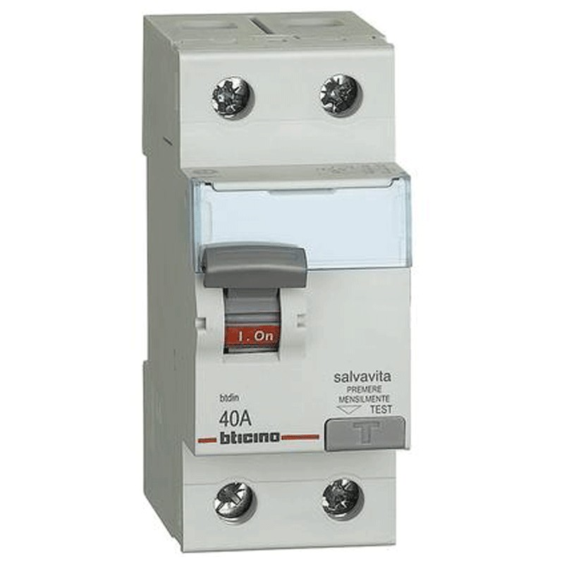 Interrupteur différentiel pur (disjoncteur) Bticino, 2 modules, prise DIN (universel pour tout types de central, 2P pôles, 40 ampères, courant différentiel Idn 0,03A, tension 230/400 Vac, différentiel type A.