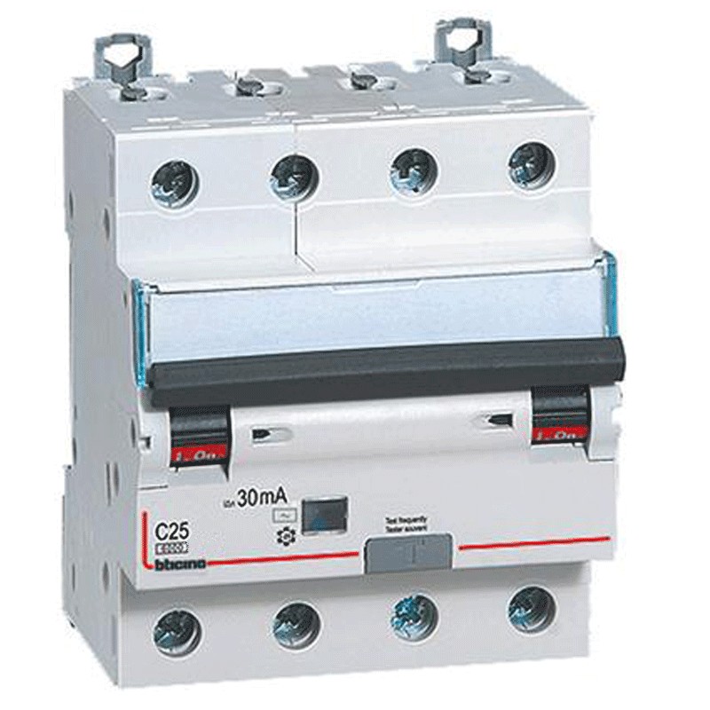 Bticino 4P 25A 30mA AC disjoncteur thermomagnétique différentiel 6kA 4 modules GN8843AC25