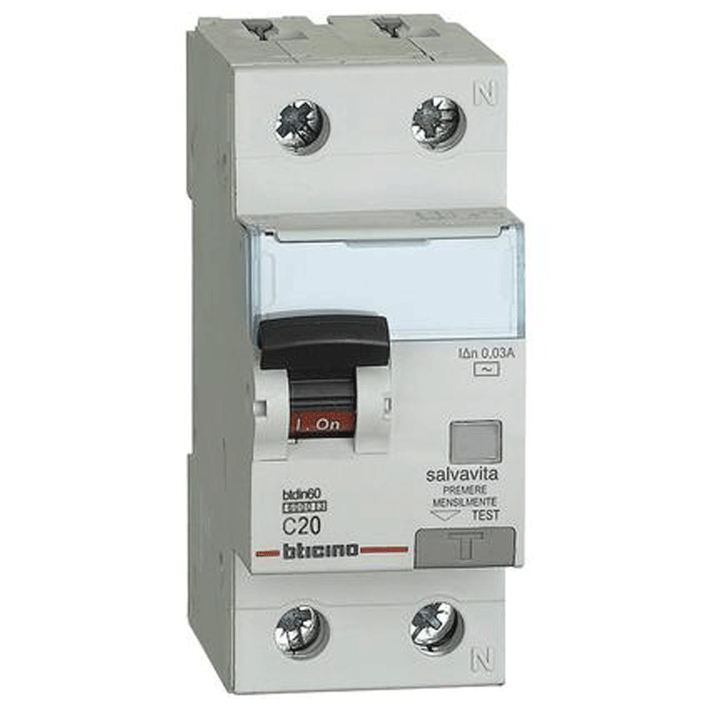 Disjoncteur magnétothermique différentiel Bticino, 2 modules, connexion DIN (universel pour tout tableau du marché), pôles 1P+N, 20 ampères, pouvoir de coupure 6kA, tension 230 Vac, courant différentiel Idn 0,03A, type AC, courbe de déclenchement C.