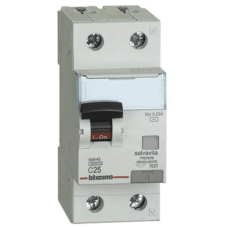 Disjoncteur magnétothermique différentiel Bticino, 2 modules, connexion DIN (universel pour tout tableau du marché), pôles 1P+N, 25 ampères, pouvoir de coupure 4,5kA, tension 230 Vac, courant différentiel Idn 0,03A, type AC, courbe de déclenchement C.