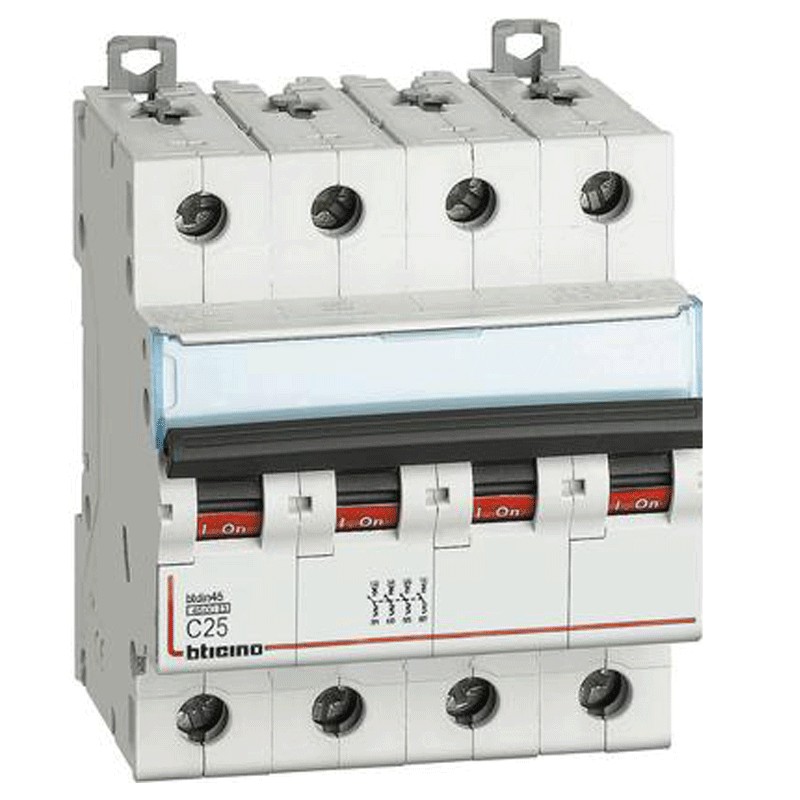 Interrupteur magnétothermique: 4 modules raccord DIN- (attaque universelle pour n'importe quel standard sur le marché) (Marque: Bticino) Pôles (4P) (Ampères: 25) (pouvoir de coupure: 4.5 kA)(Courbe: C)