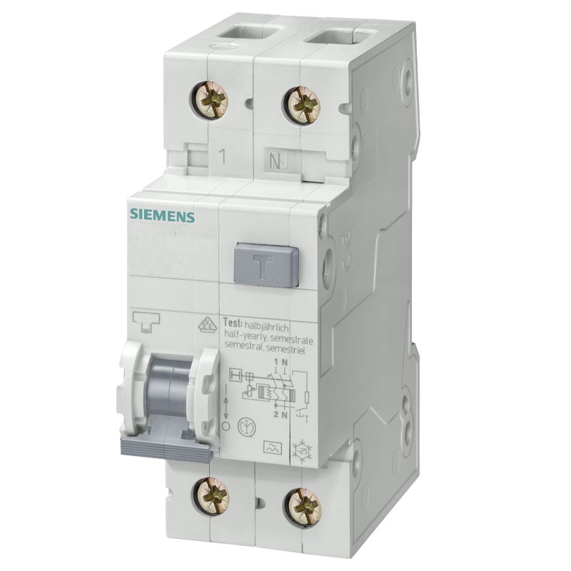 Disjoncteur différentiel Siemens, 2 modules, connexion DIN (universel pour tous les tableaux du marché), pôles 1P+N, 20 ampères, pouvoir de coupure 4,5kA, tension 230/240 Vac, courant différentiel Idn 30mA, type A, courbe de déclenchement C.