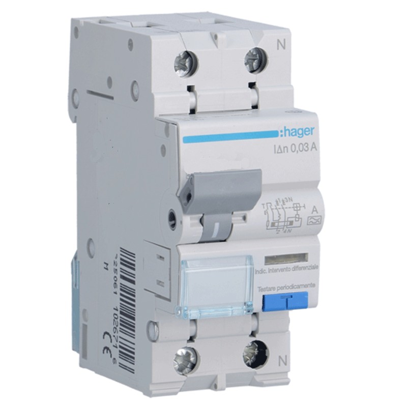Interrupteur magnétothermique différentiel Hager, 2 modules, connexion DIN (universel pour tout tableau du marché), 1P+N, 16 ampères, pouvoir de coupure 4,5kA, tension nominale 240 Vac, courant différentiel nominal 30mA, type A, courbe de déclenchement C.