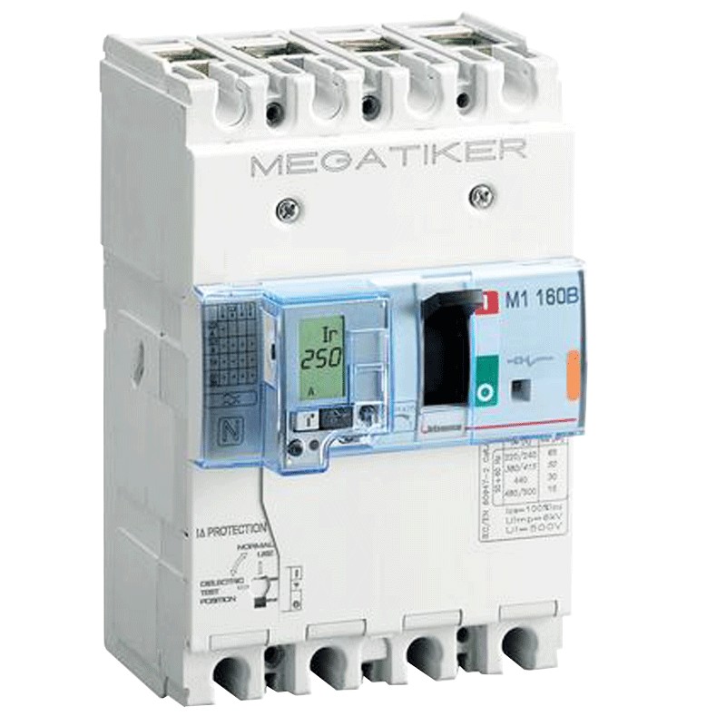 Disjoncteur magnéto-thermique MEGATIKER M1 160B à boîtier moulé avec les caractéristiques suivantes :