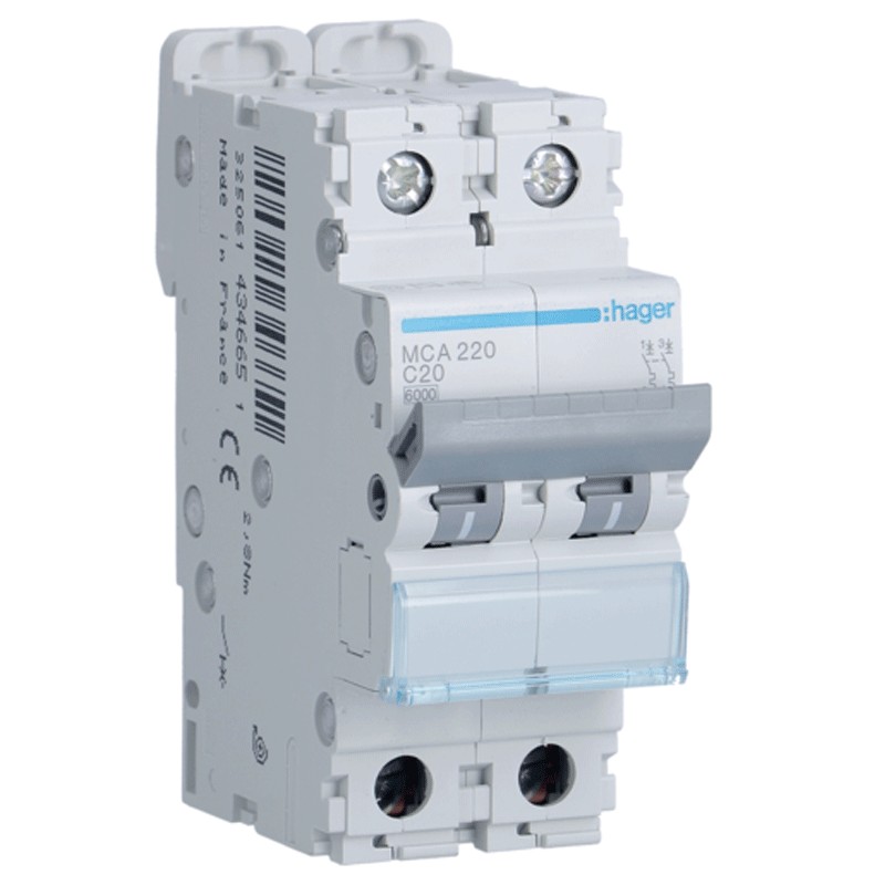 Interrupteur magnétothermique Hager 2P 20A 6 KA C 2 modules MCA2200