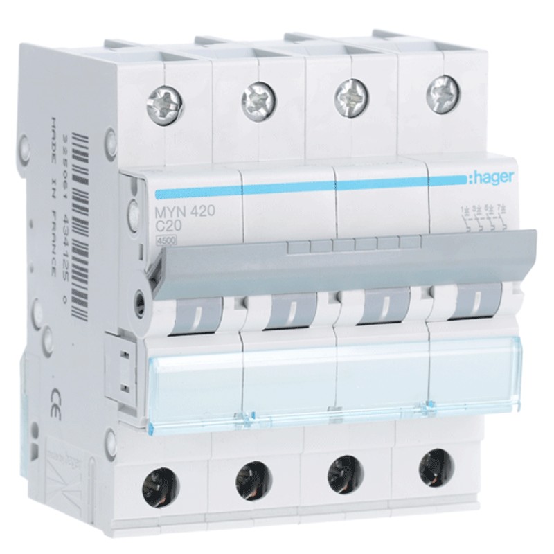 Interrupteur magnétothermique Hager 4P 20A 4.5 KA C 4 modules MYN420