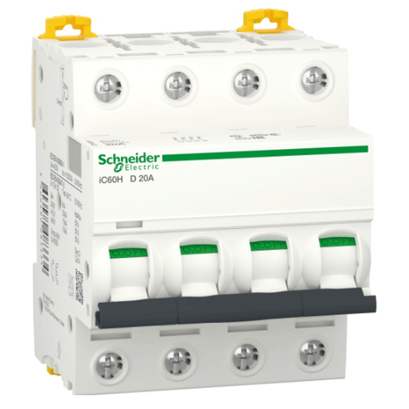 Interrupteur magnétothermique Schneider 4P 20A 10KA D 4 modules A9F85420