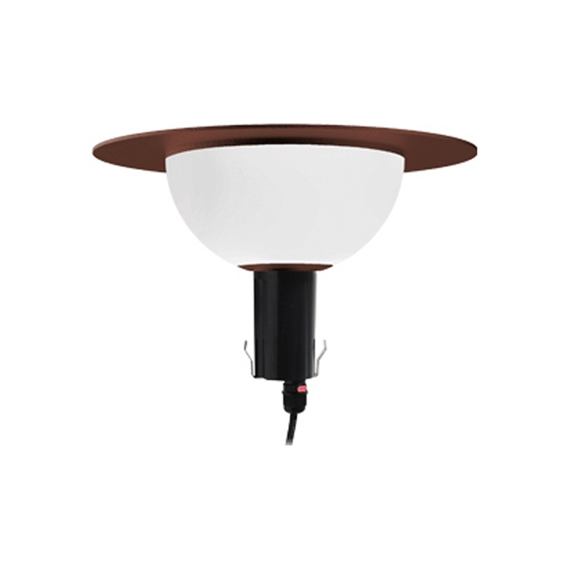 Diffuseur FBT Mareco Saturno avec connexion E27 (ampoule non incluse), pour utilisation sur des poteaux de Ø60mm avec bride de 3mm maximum, couleur Corten. Dimensions : diamètre 320 mm x hauteur 200 mm.