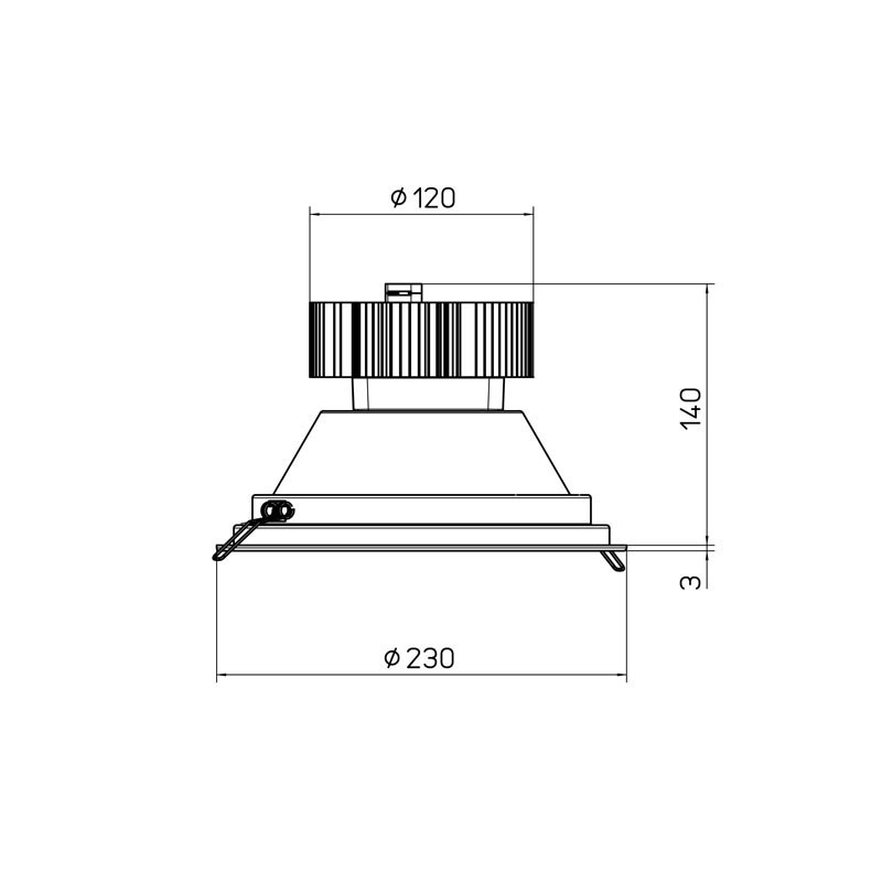 Faro en retrait Côté LED 21W 1734 lumens 3000K (lumière chaude), diamètre 230 mm, Trou de la récréation dia.205 mm, Épaisseur de plafond: 5 à 30 mm, montage: fil d'acier à Ressort, bloc d'alimentation: Built-dans le module de LED, alimentation 220V, le faisceau de lumière Symétrique diffuse 90 °