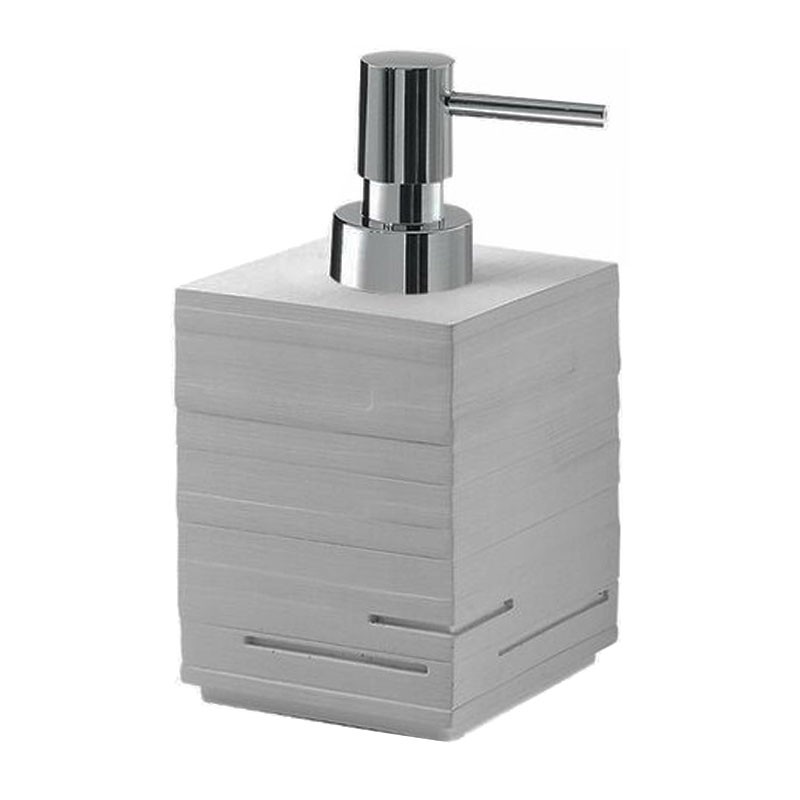 - 1 distributeur de savon liquide sur pied, en résine, avec distributeur en plastique chromé, dimensions 8,2x8,2x16cm.